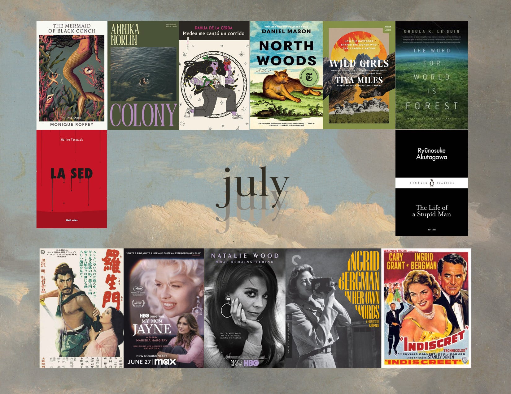 As I rounded up July’s reads, I found a coincidental thread that wove many of the books together — one of nature and appreciation. Of the eight books I read in July, six featured nature as a refuge, a companion, and a guide. In Colony, our characters escape into the forest, overwhelmed by modern life. In North Woods, the woods of Western Massachusetts are a vessel through which the story of humanity is told. In The Word for World is Forest, one forest is the lifeline of an entire species. Not to mention Wild Girls, which focuses on the role nature had on girls who went on to become trailblazing women.